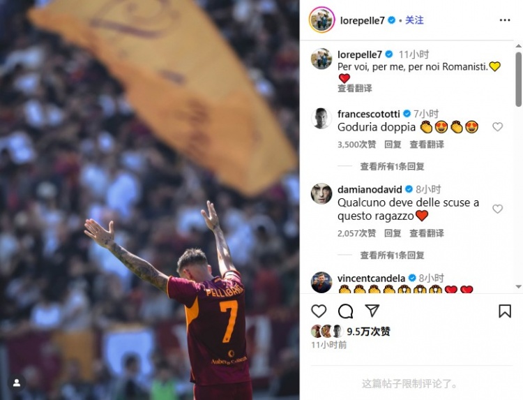 9月22日讯 昨晚,罗马在德比战1-0击败拉齐奥,洛伦佐-佩莱格里尼赛后发文庆祝,罗马名宿托蒂也在评论区现身。