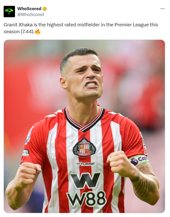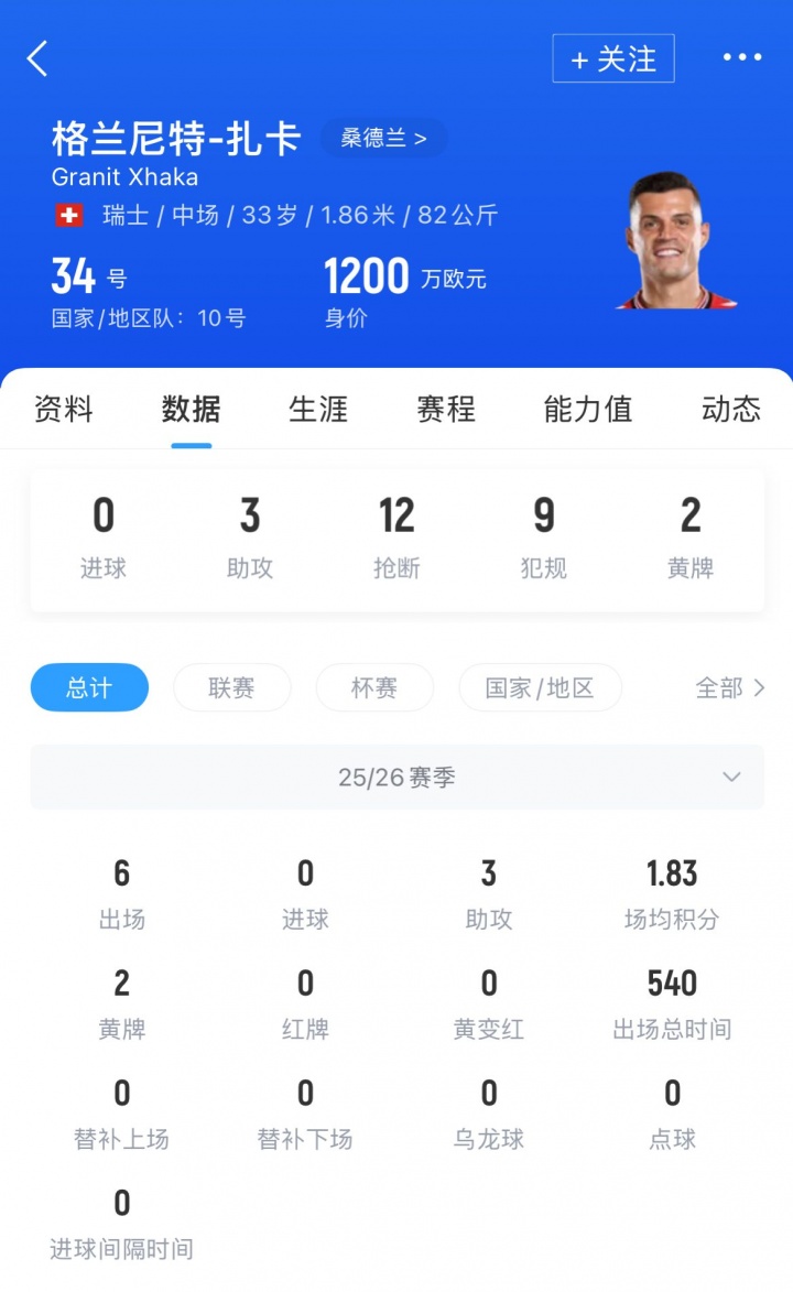 33岁的瑞士中场球员扎卡本赛季为桑德兰出战了6场赛事 ,贡献3个助功 。六场赛事 他获得的sofascore评分分别为:6.6、6.9、7.5、7.7、6.9以及8.5。另一家评分机构WhoScored的数据则显示扎卡是英超本赛季目前为止评分最高的中场球员球员。
