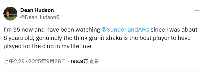 英超升班马桑德兰本赛季开局表现出色, 6轮仅1负目前排名前5。球队新援、领队 扎卡的出色表现引发了一位23年桑德兰本土老球迷的赞叹。